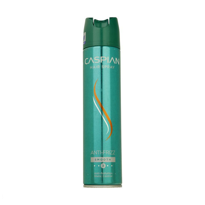 اسپری حالت دهنده و ضد وز مو کاسپین حجم 250 میلی لیتری با ویژگی درخشان کننده، تثبیت کننده و صاف کننده مو با قدرت نگهداری حالت مو سطح 3