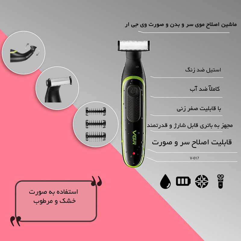 کمپانی VGR یک شرکت پیشرفته با فناوری بالا که دارای ماشین آلات، تجهیزات پیشرفته و سیستم مدیریت استاندارد است و به دلیل متریال مرغوب، تمامی محصولات آن دارای کیفیتی اروپایی و مورد تایید استاندارد اروپا CE قرار گرفته است که محصولات خود را به تمامی نقاط جهان از جمله اروپا، آمریکای ، خاورمیانه، هند و آفریقا صادر میکند. یکی از دستگاههای جدید و بسیار کاربردی این کمپانی ماشین اصلاح حرفهای V-017 است که به دلیل طراحی خاص و منحصر به فرد در مدت کمی در لیست محصولات پر فروش قرار گرفت وبه راحتی میتوان هر جا با خود برد که بسیار مناسب برای صورت ، بدن ، سر ، زیر بغل ، پشت ، گردن ، بازو است. این ماشین اصلاح دارای تیغه دو طرفه تیز و برنده از جنس استیل ضدزنگ است که در مقابل هوا و رطوبت از مقاومت خیلی بالایی برخوردار است از دیگر ویژگیهای این دستگاه میتوان به ضد آب بودن آن اشاره کرد که به راحتی میتوان زیر آب گرفت همچنین قابلیت صفر زنی آن به راحتی ضخمیمترین و ریزترین موها را به دام میاندازد. علاوهبر این دارای سه شانه اصلاح در اندازه های 1، 3 و 5 میلی متر است که برای اصلاح موهای بلند تر قابل استفاده است. از طرفی این دستگاه به باتری قابل شارژ و قدرتمند لیتیوم و موتور پرقدرت و بادوام مجهز است.